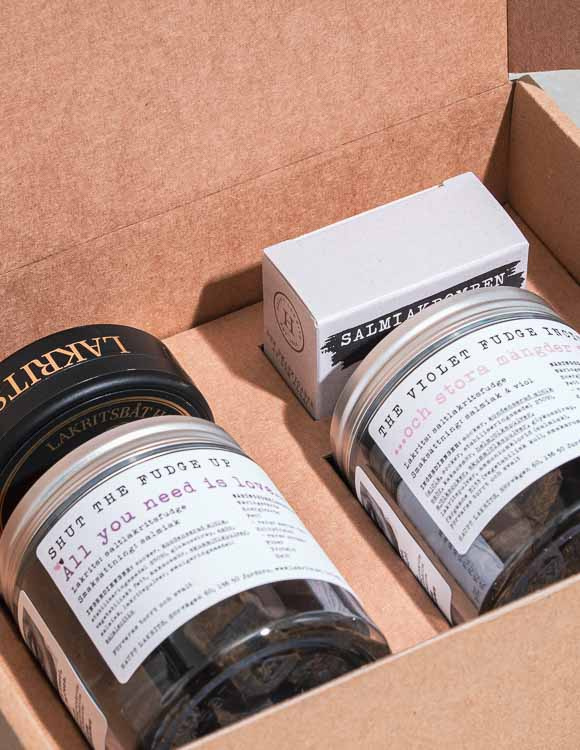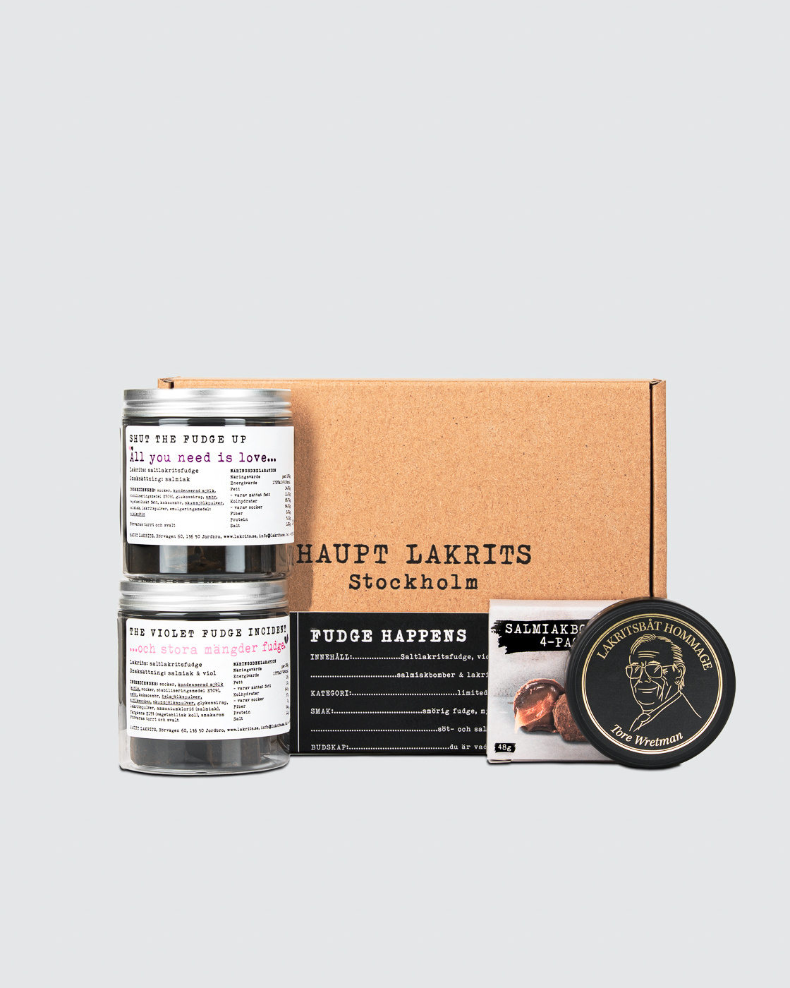 Denne gaveæske er fyldt med nogle af vores mest elskede – og mest kompromisløse – lækkerier. Vores bestseller Shut the Fudge Up møder nyheden The Violet Fudge Incident. Tilføj en klassisk Lakritsbåd Hommage Tore Wretman og en 4-pak af den bedste af dem alle – Salmiakbomben – og du har en æske, der løser flere problemer end terapi.
