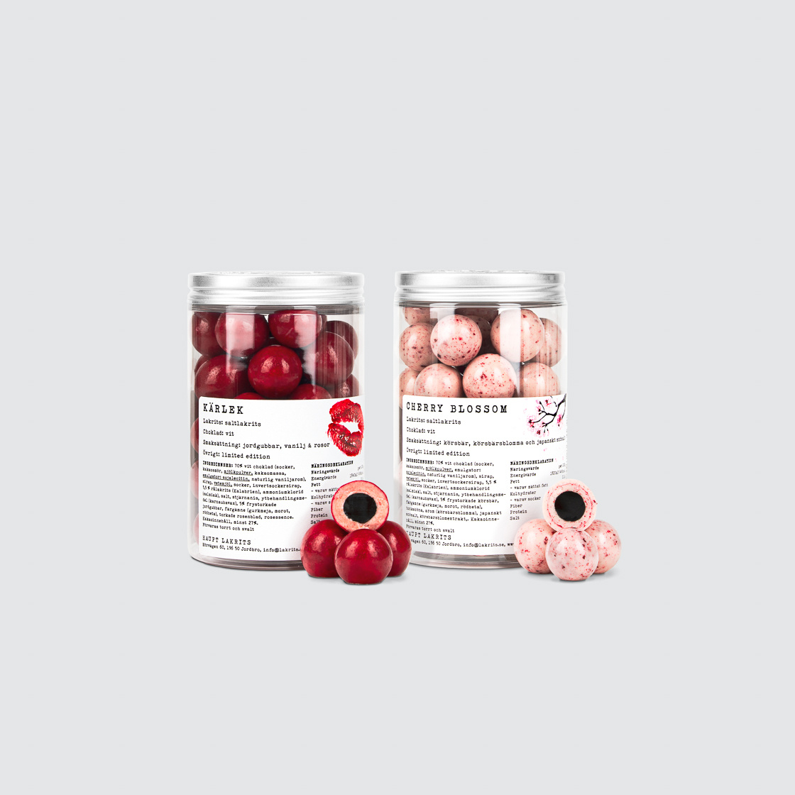 Kärlek (250 g) – langtidskogt saltlakrids møder hvid chokolade, jordbær, vanilje og roser. Sødt, salt og fuldstændig uimodståeligt. En flirt, der bliver hængende.