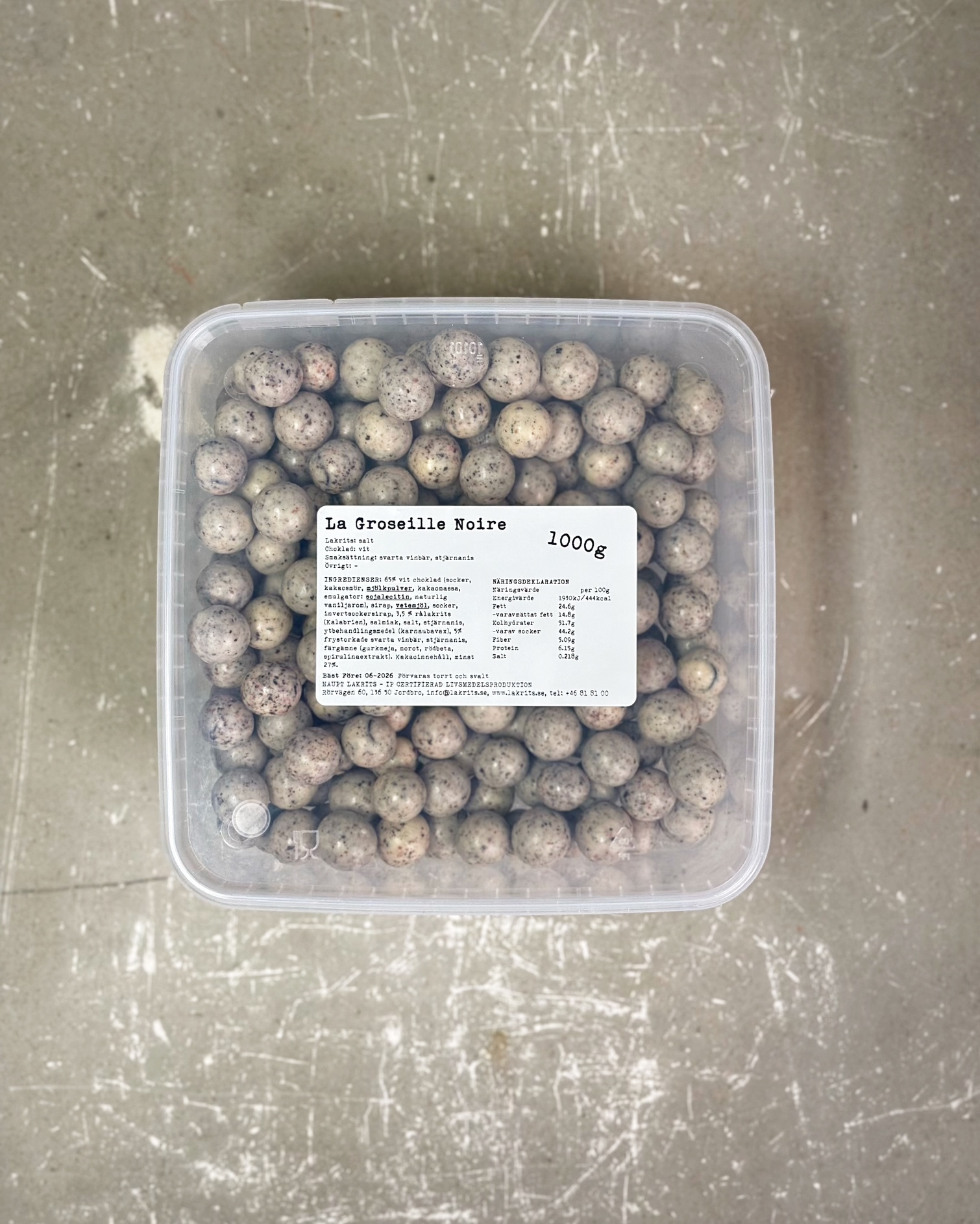 65 % hvid chokolade (sukker, kakaosmør, Mælkepulver, kakaomasse, emulgator: Sojalecithin, naturlig vaniljearoma), sirup, Hvedemel, sukker, invertsukkersirup, 3,5 % rå lakrids (Calabrien), salmiak, salt, stjerneanis, overfladebehandlingsmiddel (carnaubavoks), 5 % frysetørrede solbær. Kakaoindhold: mindst 27 %.