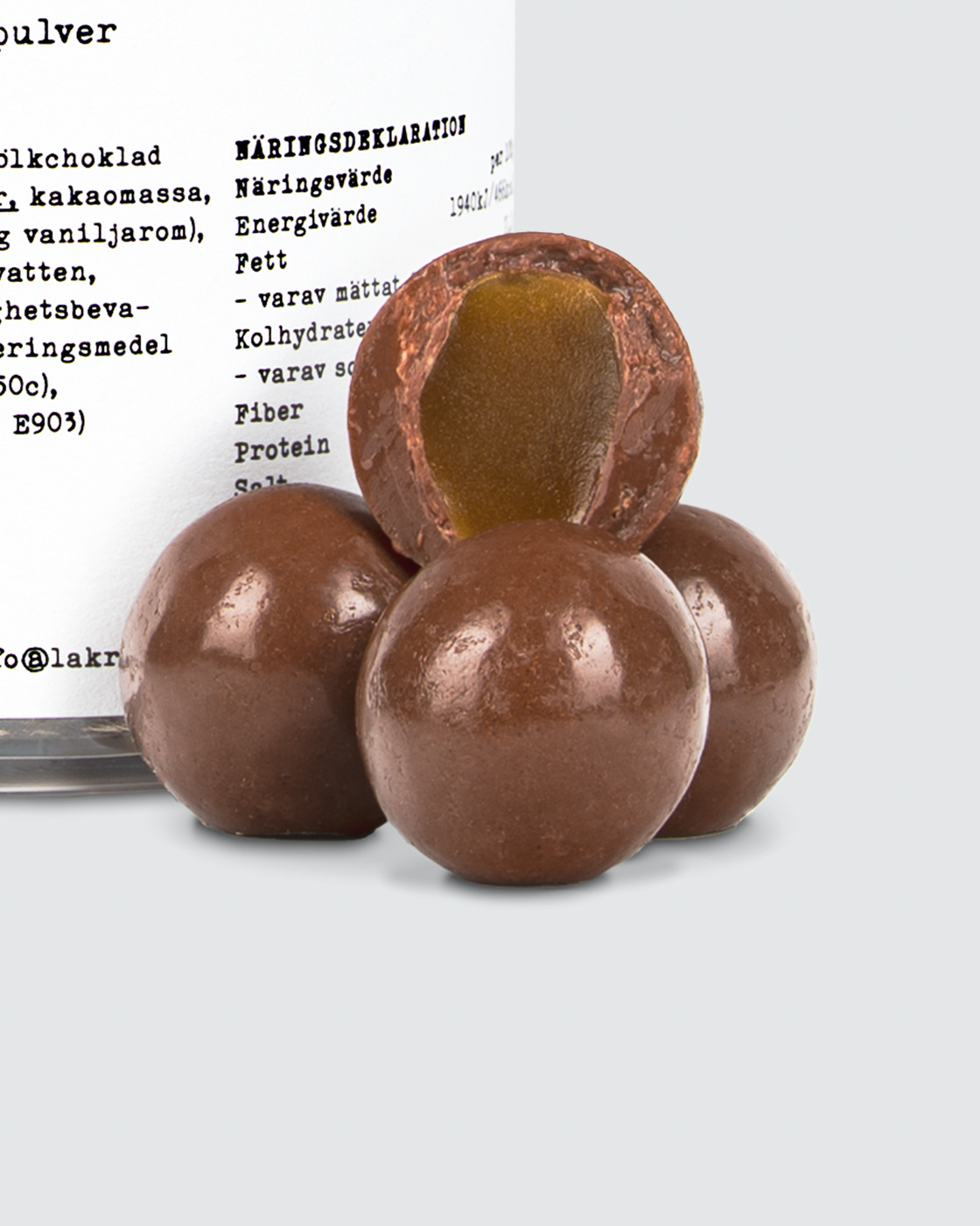 En karamelsød kerne overtrukket med belgisk mælkechokolade med salmiakpulver.